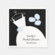 Bonito guardanapo de papel chá de panela com um vestido estilizado de casamento e flores em azul e branco sobre fundo preto. Um design personalizável para você personalizar com seu próprio texto, imagens e ideias.