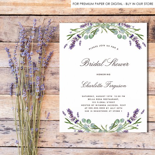 Um fundo branco elegante decorado com flores de lavanda roxa e folhagem de eucalipto. Personalize e adicione um nome e uma data.