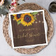 Festa de chá de panela de chic rusticy country personalizou guardanapos de papel em um fundo de madeira marrom apresentando um buquê de girassóis dourados amarelo e um roteiro elegante de caligrafia dourada.++ Fácil de personalizar com seus detalhes! Adequado para o verão ou outono cair ao ar livre jardim, fazenda, celeiro, chás de panela rústicos do quintal, brunch ou festas de almoço.
