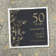 Estas elegantes guardanapos de aniversário de casamento de 50 anos, com flores pretas e douradas, podem ser personalizados com as suas informações em tipografia dourada moderna. Concebidos por Thisisnotme©