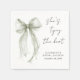 Guardanapos elegantes para o seu chá de noiva com uma bela aquarela de um laço coquette verde sage, "Ela está dando o nó" em uma caligrafia chic, e o nome da noiva e a data do chá em letras simples.