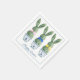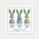 Guardanapos de festa de Páscoa de papel apresentam topiárias de coelho verde com laços rosa, azul e amarelo em vasos de flores de chinoiserie azul e branco. Personalize a mensagem de feriado com o texto especial da sua escolha.
