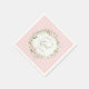 This napkin design has a wreath of pink flowers in a wreath with a pink striped background with text that says "Christ the Lord is Risen."