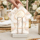 Uma graciosa composição de rosas rosa claro e pêssego aninhadas em ornamentos de marfim, formando uma moldura barroca refinada em torno do painel central. Folhas de cor suave e delicados ramos de lavanda suavizam a estrutura, enquanto a tipografia dourada quente adiciona um toque polido e régio. A paleta parece aérea e romântica — perfeita para uma celebração atemporal e feminina com charme europeu clássico.