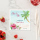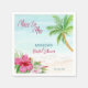 Chuva de noiva tropical de verão impressa guardanapos modelo, praia aqua azul aquarela, palmeira, flores de hibisco, magenta e azul, moderno casual pincel script personalizado mesa de jantar de noiva