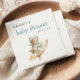 Esses guardanapos para chuveiro de bebê apresentam um urso de pelúcia em aquarela vestido de astronauta, pilotando um foguete abaixo das palavras "chuveiro de bebê" em fonte azul-esverdeada impressa à mão. Personalize o texto com o nome da futura mamãe e a data em cinza carvão sem serifa.