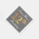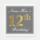 Este simples e elegante design de guardanapo de papel apresenta uma mensagem como "Aniversário do 12 do Nome-Aqui" (com o "12" a ter uma coloração falsa em ouro) numa área quadrada colorida de cinza com um contorno de fronteira simples. O nome está em um texto semelhante a script de cor branca e pode ser personalizado. Napkins como estes poderia talvez ser usado numa festa de aniversário para alguém que comemora seu décimo segundo aniversário. [~Z0000191]