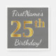 Este simples design de guardanapo de papel apresenta uma mensagem como "Aniversário do 25 do Primeiro Nome!", com o "25" a ter uma aparência falsa/imitada de ouro, sobre um fundo de cinza (cinza) colorido. O nome pode ser personalizado. Pode ser usado numa festa de aniversário para alguém que comemora seus vinte e cinco anos. [~Z0000190]