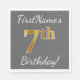 Este simples design de guardanapo de papel apresenta uma mensagem como "Aniversário do 7 do Primeiro Nome!", com o "7" a ter uma aparência falsa/imitada de ouro, sobre um fundo de cinza (cinza) colorido. O nome pode ser personalizado. Pode ser usado numa festa de aniversário para alguém que comemora seu sétimo aniversário. [~Z0000190]
