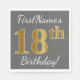 Este simples design de guardanapo de papel apresenta uma mensagem como "PrimeiroNome é 18º Aniversário!", com o "18º" a ter uma aparência falsa/imitação de ouro, sobre um fundo colorido de uma cinza (cinza). O nome pode ser personalizado. Pode ser usado numa festa de aniversário para alguém que comemora seu décimo oitavo aniversário. [~Z0000190]
