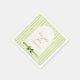 Custom square paper napkins featuring green stripes, arched couple's names, wedding date, and satin bow accent for elegant reception tables. Coordinates with striped seating charts, menus, and stationery suite for that modern retro vibe.