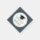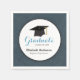 Este guardanapo de pós-graduação apresenta um gráfico de um chapéu de graduação (mortarboard) e texto personalizável para o ano, o nome do formando e o nome de sua escola. O fundo é o denim azul.
