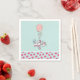 Feliz aniversário de guardanapos de papel com um coelhinho branco e branco, segurando um grande balão rosa flutuando no ar. Uma faixa de aniversário de rico com um pássaro azul diz "feliz aniversário". O fundo do guardanapo tem uma borda de círculos de bolinhas rosa. Colocado sobre um fundo azul claro.