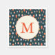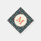 A festive holiday napkin design featuring colorful retro Christmas ornaments scattered on a navy blue background. The bold serif monogram stands out in a cream circle for a personalized touch. Perfect for holiday parties, Christmas dinners, or winter weddings.