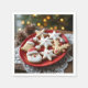 Biscoitos festivos em forma de Papais noeis, renas, estrelas e sinos são dispostos em uma placa vermelha com renda suave