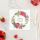 Guardanapo de casamento personalizado retrata uma coroa floral em aquarela elegante com rosas vermelhas e rosadas, frutos e folhagens. Apresenta os nomes dos noivos e a data. Boa escolha para casamentos de Natal e inverno.