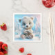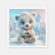 Um filhote agudo de urso polar com olhos e patas grandes e expressivos em posição cardíaca senta-se em uma paisagem nevada cercada por cristais espumantes de gelo