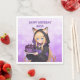 Cute personalized birthday paper napkins for a girl's birthday party. A sweet anime girl in a fox ears hoodie holding a purple and black birthday cake.