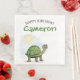Estes guardanapos de festa personalizados apresentam uma ilustração fofa da tartaruga bebê. Uma pequena tartaruga verde é colocada na parte inferior esquerda com um sol brilhando sobre ela. É bom para um chá de bebê ou festa de aniversário de criança. Uma amostra de mensagem "Parabéns" é impressa no topo, seguida de um nome de amostra. Você pode personalizar os guardanapos para incluir seu próprio nome personalizado ou mensagem de sua escolha.