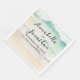 Estas guardanapos de casamento elegantes apresentam uma imagem de praia na frente. A parte inferior apresenta uma bela praia arenosa, com água turquesa na parte superior. As ondas estão a salpicar a areia sob o sol. As informações do casamento são impressas no centro em uma fonte preta.