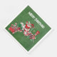 Este guardanapo de papel tem o Pai Natal andando em um trem de Natal vermelho e branco com rodas de chocolate de hortelã e carregando e cartas para Papais noeis em um fundo verde escuro. Personalize o texto Feliz Natal com o modelo.