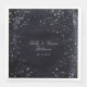 Um guardanapo de noiva preto e prateado sofisticado para combinar a placa de papel jante com uma lavagem a cores preta com estrelas cintilantes de prata e seus nomes em uma caligrafia clássica em inglês.
