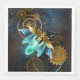 Barbeiro véu com asas transparentes azuis e lâmpada verde sobre fundo vestido, marrom, texturizado. Estilo Steampunk.