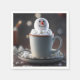 Uma caneca de chocolate quente tocada com marshmallows, coroada com um boneco de neve em miniatura. A iluminação quente e a marshmallow espalhadas criam uma atmosfera confortável e festiva.