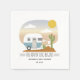 Adventure temed desert chá de fraldas com ilustração de um retrorreflector vintage com roupas de bebê e cacto. texto diz: "A aventura começa"