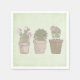 Guardanapos de papel com um design. 3 cactos bonitos todos seguidos com rostos sorridentes sentados em uma floreira cada um vestindo algumas joias.