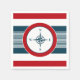 Design náutico com decoração em forma de bússola, em fundo listrado a azul, vermelho e branco