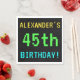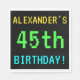 Este divertido design de guardanapo de papel apresenta uma mensagem como "ANIVERSÁRIO DE 45 ANOS DE ALEXANDRE!". Também apresenta uma aparência divertida e pixelada que lembra a aparência dos jogos de computador da era de 8 bits dos anos 80 e início dos anos 90. O nome pode ser personalizado. Poderia ser usado em uma festa de aniversário para alguém que está celebrando seu aniversário de 45 anos e que gosta de jogar videogames retrô.