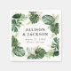 Os guardanapos tropicais, elegantes, com nomes e data de casamento cercados por uma borda de folhas de monstera com folhas falsas de ouro e folhas verdes. Design coordena com a nossa coleção de casamento Tropical Dourada.
