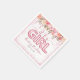Rapazes chás de fraldas bonitos, com um simples fundo branco, brilhos elegantes e confetti, florais cor-de-água cor-de-rosa bonito, o ditado "é uma menina", o nome da futura mãe e a data da celebração.