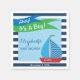 Este guardanapo de papel de chá de fraldas apresenta um tema náutico. Um fundo de listras horizontais brancas e azuis escuras é acentuado com uma bandeira verde e azul acenando no topo e uma vela giratória bonita perto do fundo. O texto sobre as bandeiras diz: Ahoy! É um menino! O texto personalizável no meio permite adicionar o nome da mãe e a data do chá.