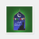 Eid Mubarak saudando a ilustração com uma cena noturna festiva: uma terra colorida, a lua e as estrelas e uma silhueta de uma mesquita exibida em uma janela árabe sobre um fundo com padrão verde.