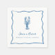 Nossas guardanapos para chá de noiva com tema de lagosta são perfeitos para a sua celebração à beira-mar! O design costeiro caprichoso apresenta letras e ilustrações em azul mediterrâneo em um fundo branco. Um desenho doodle de lagosta desenhada à mão está no topo de duas linhas de texto personalizado, tudo emoldurado por uma borda ondulada de conchas. Mostrado com "ela é um prêmio" e o nome da noiva.