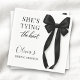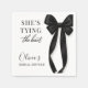 Guardanapos de festa projetados com um motivo clássico de laço preto e a frase ela está amarrando o nó. Criados para um visual limpo e elegante que combina bem com decoração de casamento preto e branco. Adequados para chás de panela, festas de noivado, despedidas de solteira e celebrações de casamento. Texto totalmente personalizável com design pronto para impressão para guardanapos de coquetel ou almoço.