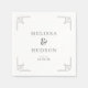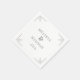 This elegant wedding napkin design features a minimalist layout with clean lines and ample negative space, creating a sophisticated and timeless look. The color palette is primarily grayscale, enhancing the understated luxury of the design. Geometric line art accents each corner, adding subtle visual interest without overwhelming the central text. The typography combines a classic serif font for the names with a modern sans-serif for additional details, ensuring readability and style. Perfect for a formal event, this design conveys a mood of refined elegance and celebration.