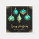 Add a touch of holiday glamour to your festive table with this teal blue and gold Christmas napkin. Featuring five hanging ornaments - each with a unique design including glittering stars, snowflakes and florals - this layout blends classic with modern elegance. Set against a rich black background with golden sparkles, it's perfect for upscale gatherings, winter parties, or seasonal celebrations.