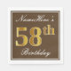 Este simples e elegante design de guardanapo de papel apresenta uma mensagem como "NameHere's 58th Birthday" (com o "58º" a ter uma coloração falsa em ouro) dentro de uma área quadrada de cor castanha com um contorno de fronteira simples. O nome está em um texto semelhante a script de cor branca e pode ser personalizado. Napkins como estes poderia talvez ser usado numa festa de aniversário para alguém que comemora seus cinquenta oitavos anos. [~Z0000139]