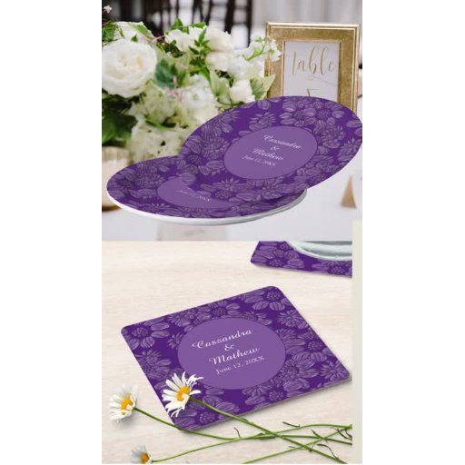 Os produtos de Casamento Roxo apresentam margaridas elegantes com uma aparência semelhante a 3D e um fundo translúcido para mostrar sua cor preferida. A seção do meio exibe um círculo sólido com os nomes do casal e sua data de casamento na frente. A parte de trás tem apenas o design. Personalize a cor do plano de fundo quando você o Editar.