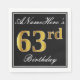 Este simples e elegante design de guardanapo de papel apresenta uma mensagem como "ANameHere's 63rd Birthday" (com o "63º" a ter uma aparência falsa de cor dourada) dentro de uma área quadrada de cor preta com um contorno de fronteira simples. O nome está em um texto semelhante a script de cor branca e pode ser personalizado. Napkins como estes poderia talvez ser usado numa festa de aniversário para alguém que comemora seu sessenta e terceiro aniversário. [~Z0000136]