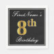 Este simples e elegante design de guardanapo de papel apresenta uma mensagem como "8.º Aniversário do Primeiro Nome" (com o 8.º a com uma coloração falsa em ouro) dentro de uma área quadrada de cor preta com um contorno simples de fronteira. O nome está em um texto semelhante a script de cor branca e pode ser personalizado. Napkins como estes poderia talvez ser usado em uma festa de aniversário para alguém que comemora seu oitavo aniversário. [~Z0000136]