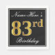 Este simples e elegante design de guardanapo de papel apresenta uma mensagem como "83.º Aniversário do Nome-Aqui" (com o "83.º" a ter uma coloração falsa em ouro) dentro de uma área quadrada de cor preta com um contorno simples de fronteira. O nome está em um texto semelhante a script de cor branca e pode ser personalizado. Napkins como estes poderia talvez ser usado numa festa de aniversário para alguém que comemora seu oitenta e terceiro aniversário. [~Z0000136]
