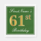 Este simples e elegante design de guardanapo de papel apresenta uma mensagem como "Aniversário de 61ruas do FirstName" (com a "61ruas" a ter uma coloração falsa em forma de ouro) numa área quadrada de cor verde que apresenta um contorno simples da fronteira. O nome está em um texto semelhante a script de cor branca e pode ser personalizado. Napkins como estes poderia talvez ser usado numa festa de aniversário para alguém que comemora seu sessenta aniversário. [~Z0000137]