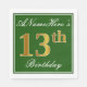 Este simples e elegante design de guardanapo de papel apresenta uma mensagem como "ANameHere's 13 Birthday" (com o "13" a ter uma coloração falsa em ouro) dentro de uma área quadrada de cor verde com um contorno simples de fronteira. O nome está em um texto semelhante a script de cor branca e pode ser personalizado. Napkins como estes poderia talvez ser usado numa festa de aniversário para alguém que comemora seu décimo terceiro aniversário. [~Z0000137]