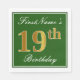 Este simples e elegante design de guardanapo de papel apresenta uma mensagem como "19.º Aniversário do Primeiro Nome" (com o "19.º" a ter uma coloração falsa em ouro) dentro de uma área quadrada de cor verde, com um contorno de fronteira simples. O nome está em um texto semelhante a script de cor branca e pode ser personalizado. Napkins como estes poderia talvez ser usado numa festa de aniversário para alguém que comemora seu décimo nono aniversário. [~Z0000137]