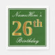 Este simples e elegante design de guardanapo de papel apresenta uma mensagem como "NameHere's 26th Birthday" (com o "26º" a ter uma cor falsa em forma de ouro) dentro de uma área quadrada de cor verde com um contorno de fronteira simples. O nome está em um texto semelhante a script de cor branca e pode ser personalizado. Napkins como estes poderia talvez ser usado numa festa de aniversário para alguém que comemora seu vigésimo sexto aniversário. [~Z0000137]