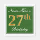 Este simples e elegante design de guardanapo de papel apresenta uma mensagem como "27.º Aniversário do Nome-Aqui" (com o "27.º" a ter uma coloração falsa em ouro) dentro de uma área quadrada de cor verde, com um contorno de fronteira simples. O nome está em um texto semelhante a script de cor branca e pode ser personalizado. Napkins como estes poderia talvez ser usado numa festa de aniversário para alguém que comemora seu vigésimo sétimo aniversário. [~Z0000137]